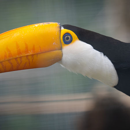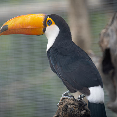 Descrição: Os Tucanos Toco são reconhecidos pelo grande bico amarelo-alaranjado com uma marca preta distinta na ponta do bico. Este bico é responsável por um terço do comprimento total da ave, medindo até 20 centímetros, é duro e cortante. As bordas do bico são serrilhadas. Esta espécie tem o que parece ser uma íris azul, mas na verdade é uma fina camada de pele que envolve o olho. O olho azul é circundado por um anel adicional de pele nua laranja. O dimorfismo sexual não é muito aparente nesta espécie, só se evidencia que os tucanos machos adultos são tipicamente maiores que as fêmeas adultas. Sua plumagem é negra, destacando-se o papo e o início das penas caudais brancos.